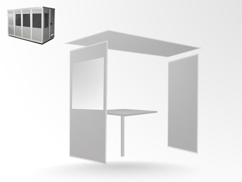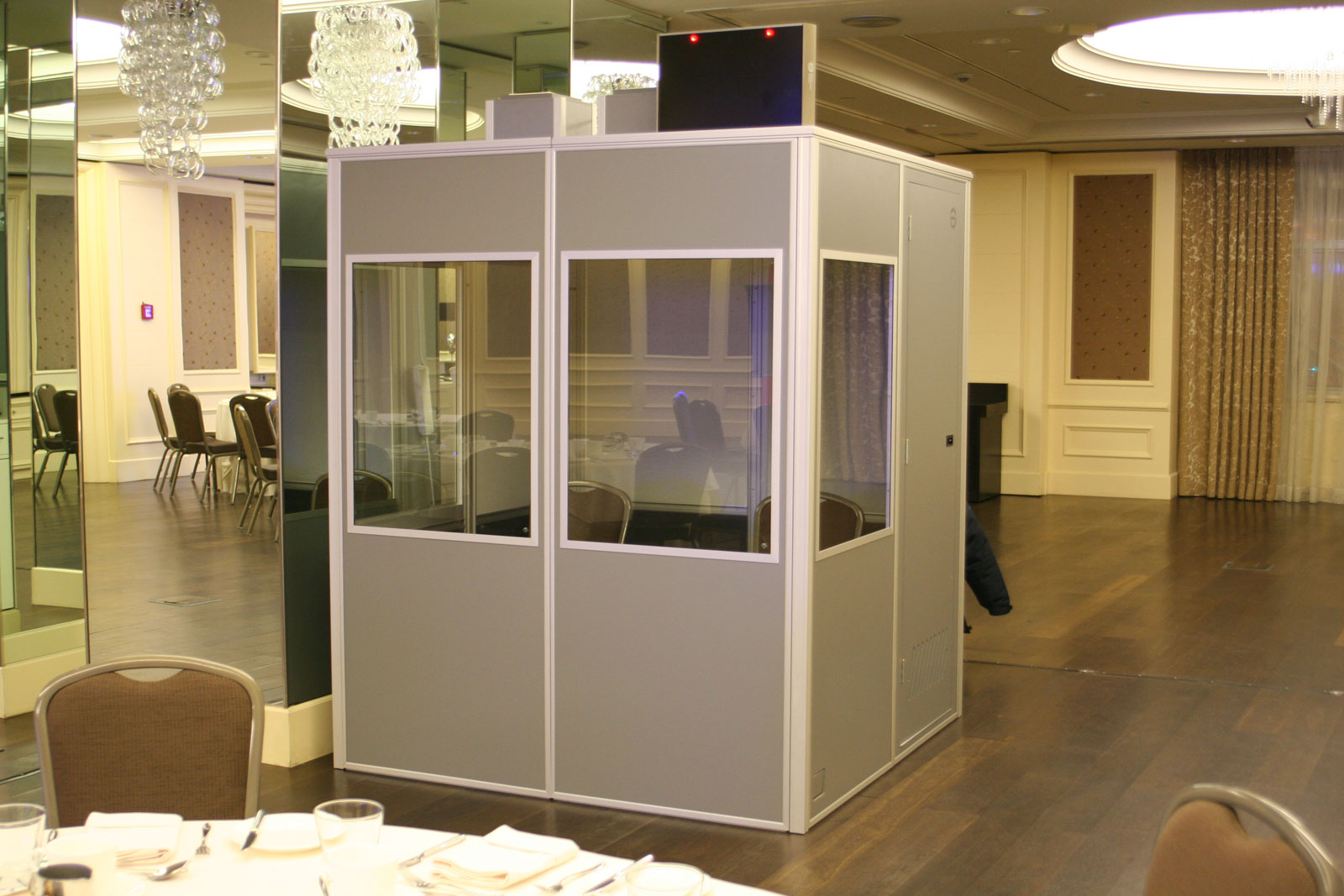 Кабина переводчиков (Audipack) - это специализированное оборудование для синхронного перевода и предназначена для звукоизоляции рабочего места переводчиков. Поглощает шумы из зала (кашель, чихание, шуршание бумаги, хлопанье дверью, разговор делегатов сидящих рядом). Оснащена большими окнами, бесшумной дверь, вентилятором, большим рабочим столом (достаточно места для установки любого типа оборудования, а именно пульта переводчика синхронного перевода, настольной лампы, ноутбука). В кабине комфортно размещаются 2 человек. Мобильная кабина быстро разбирается и транспортируется в кейсе, имеет стандартный офисный внешний вид серого цвета, изготовлена из качественного сплава алюминия и звукоизоляционного материала. Соответствует всем европейским стандартам ISO.