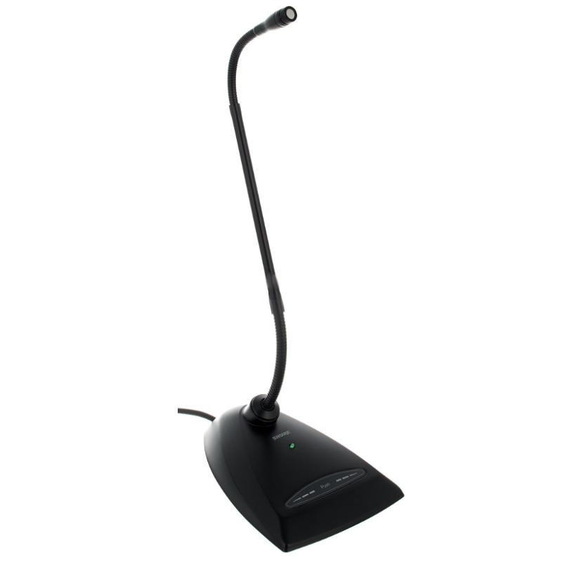 Для встановлення на трибуні або на столі президії настільний динамічний конференц-мікрофон Sennheizer або SHURE на витонченій гнучкій ніжці.